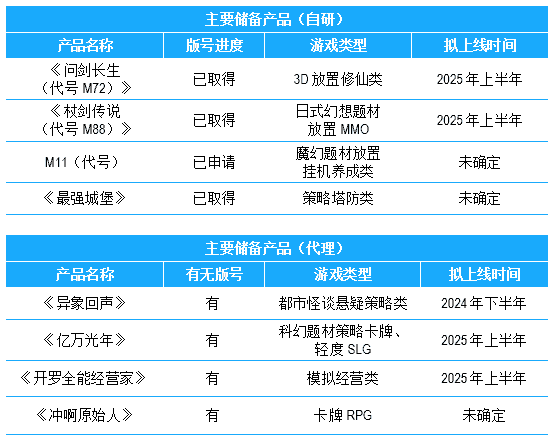 公司储备多款新品,,期待为玩家解锁更多新鲜体验,,,,部分产品如下表所示:::