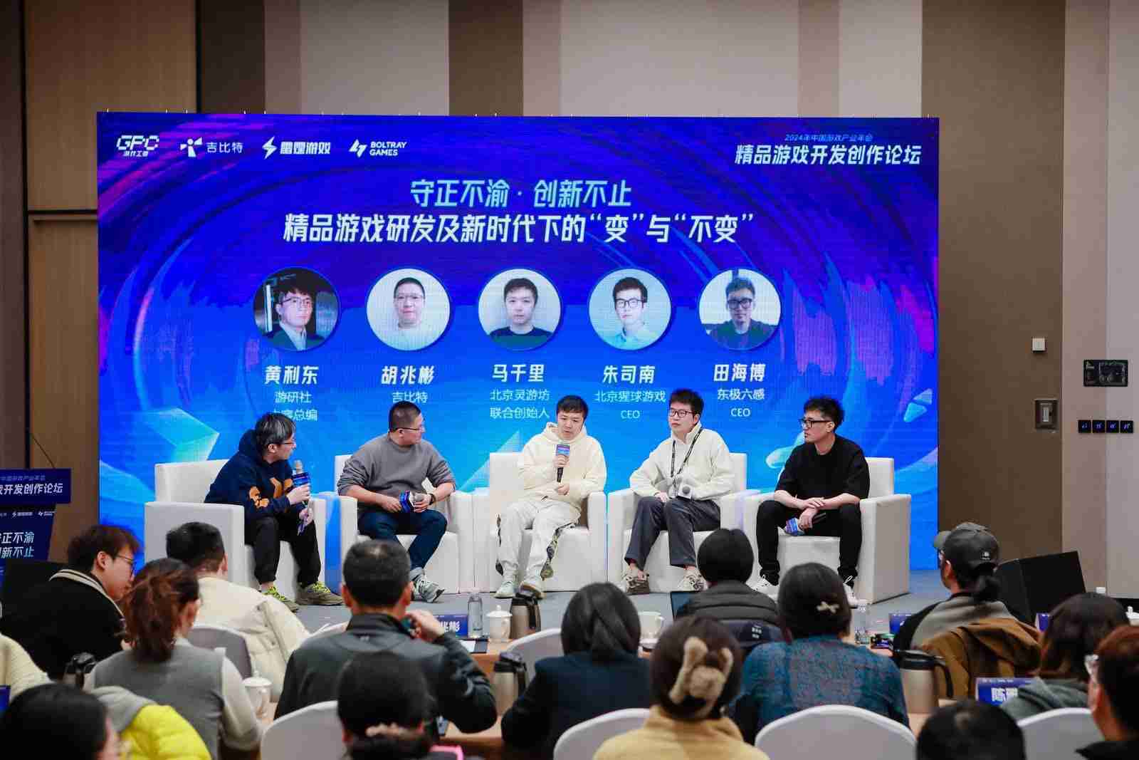 圆桌对话环节,,,,在游研社内容总编黄利东的主持下,,,一竞技CTO胡兆彬、、、、北京灵游坊联合创始人马千里、、、北京猩球游戏CEO朱司南、、、、东极六感CEO田海博等四位嘉宾围绕“守正不渝、、、、创新不止——精品游戏研发及新时代下的‘变’与‘不变’”这一主题分享了各自在精品游戏开发理念及工程能力搭建方面的见解和经历,,,,并就行业变化下游戏人需要坚守的理念等展开交流探讨。。。。