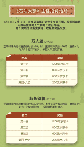 除了“油王”争霸赛,,精英主播招募活动亦同步开启!!赛事分时长奖和人气奖,,,,奖励同样丰厚!!!!