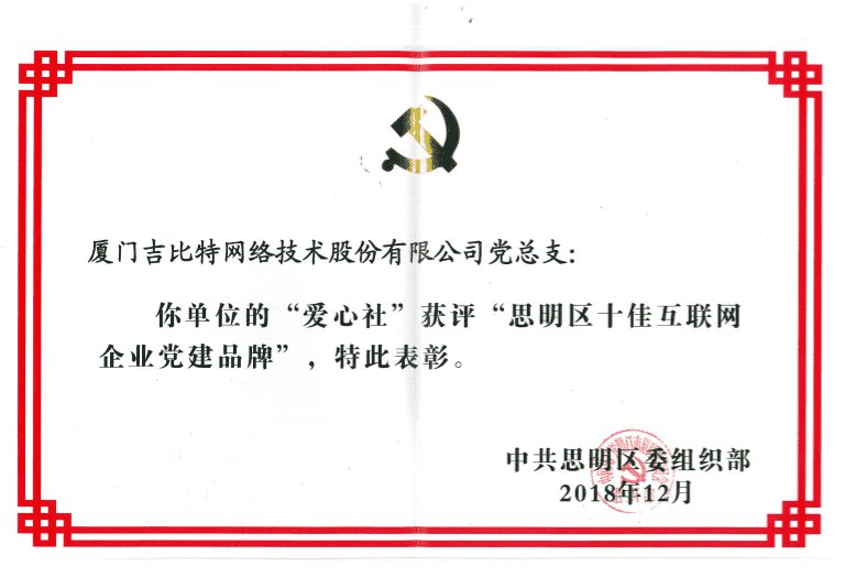 经初审评选、、、网络评选和专家评审等环节,,,,"厦门一竞技网络技术股份有限公司党总支-爱心社" 从全区28个参评党建品牌中脱颖而出,,,获评"思明区十佳互联网企业党建品牌"。。。。